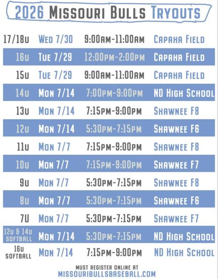 Tryouts will be held in July 2025 for the 2026 Missouri Bulls season. Visit our website at www.missouribullsbaseball.com or call 618-306-2265 for dates, more information, and registration.
